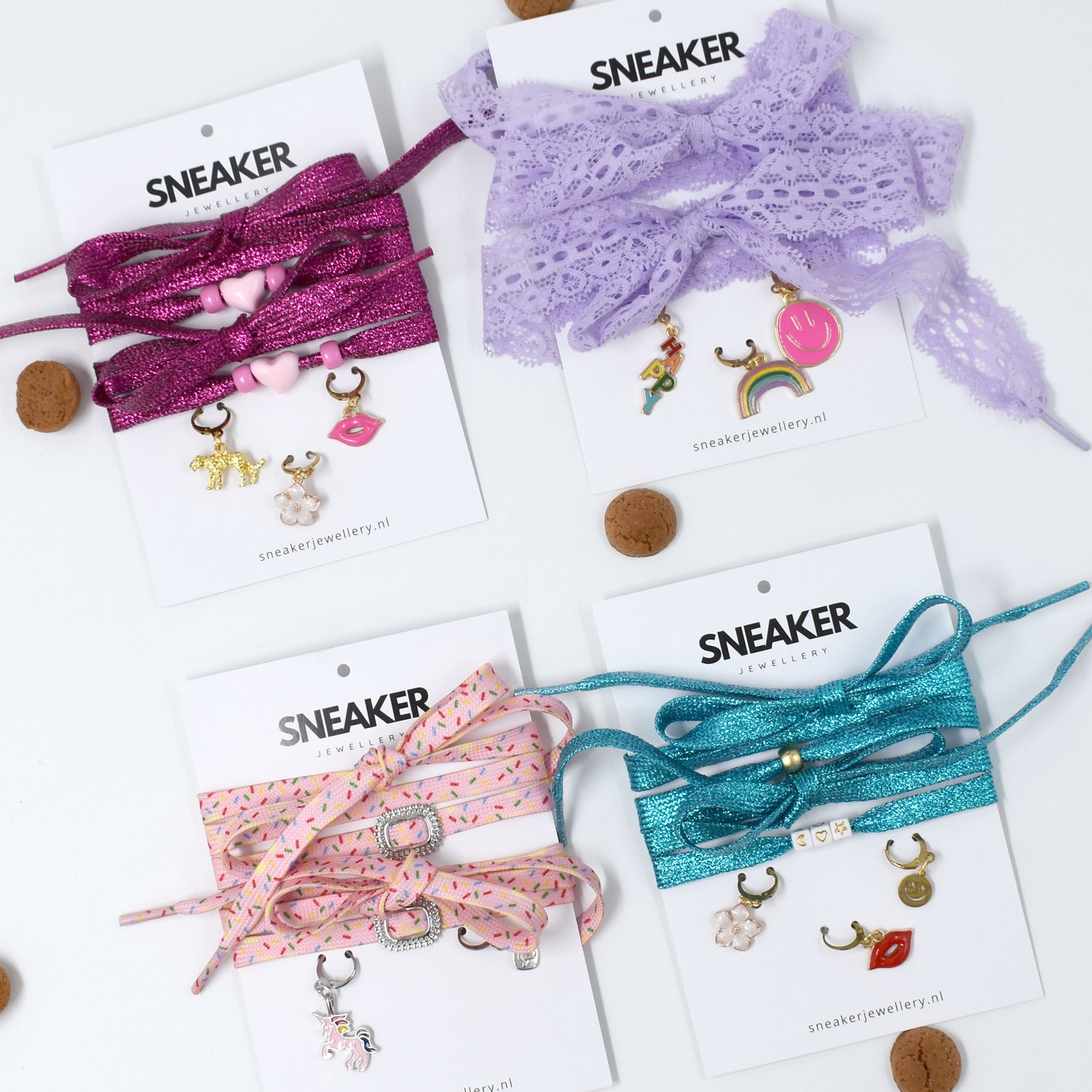 Geef een origineel cadeau! Ontdek onze super leuke sets met kleurrijke veters in kant en glitter. Wat is jouw favoriet?