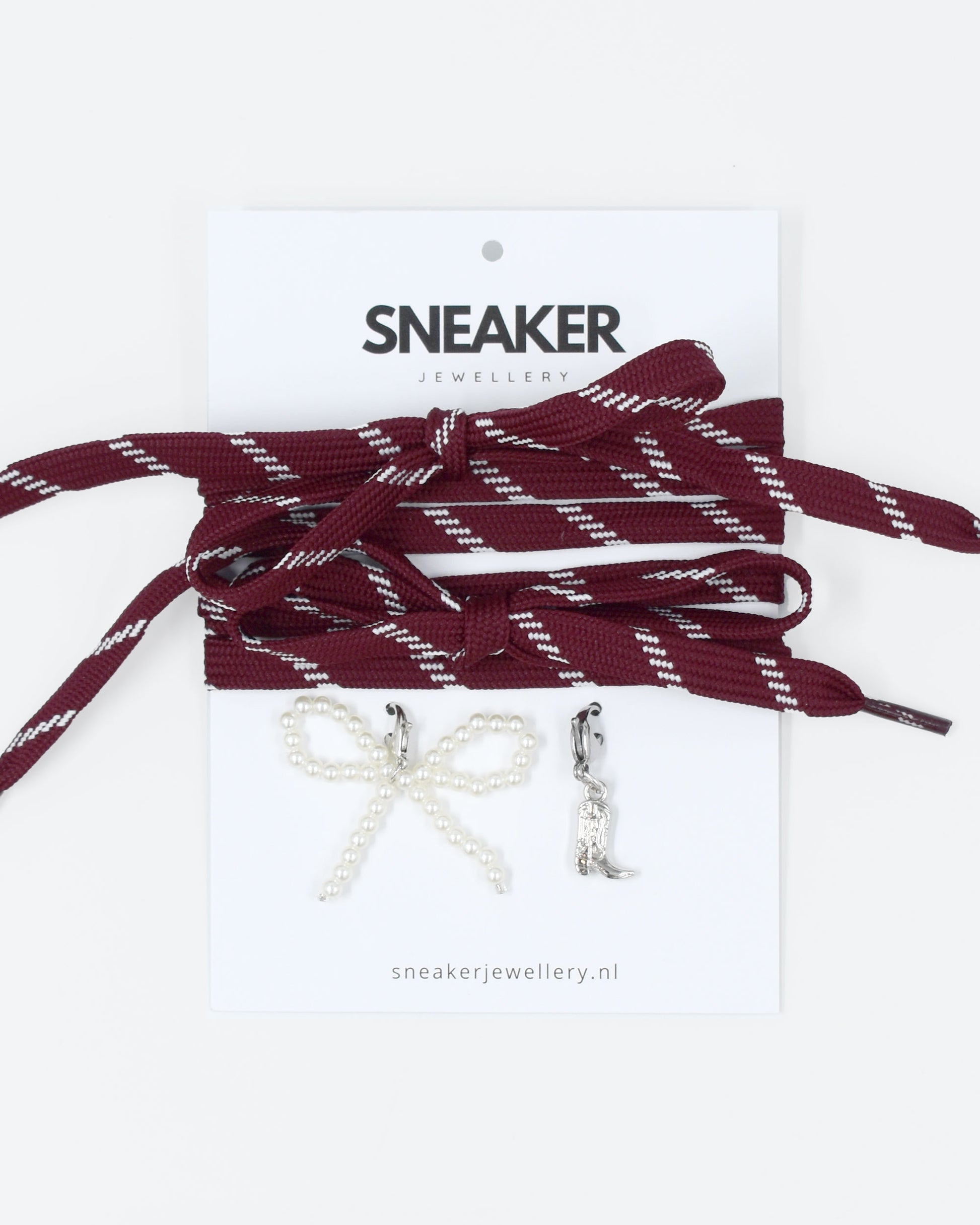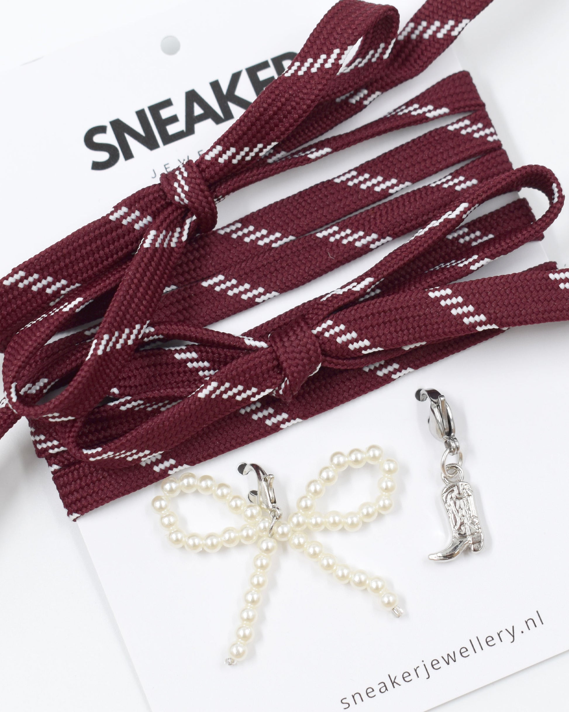 Geef je sneakers een gedurfde upgrade met onze veters en bedeltjes. Deze toffe bordeaux rode platte veters met bedels geven je sneakers een unieke look.