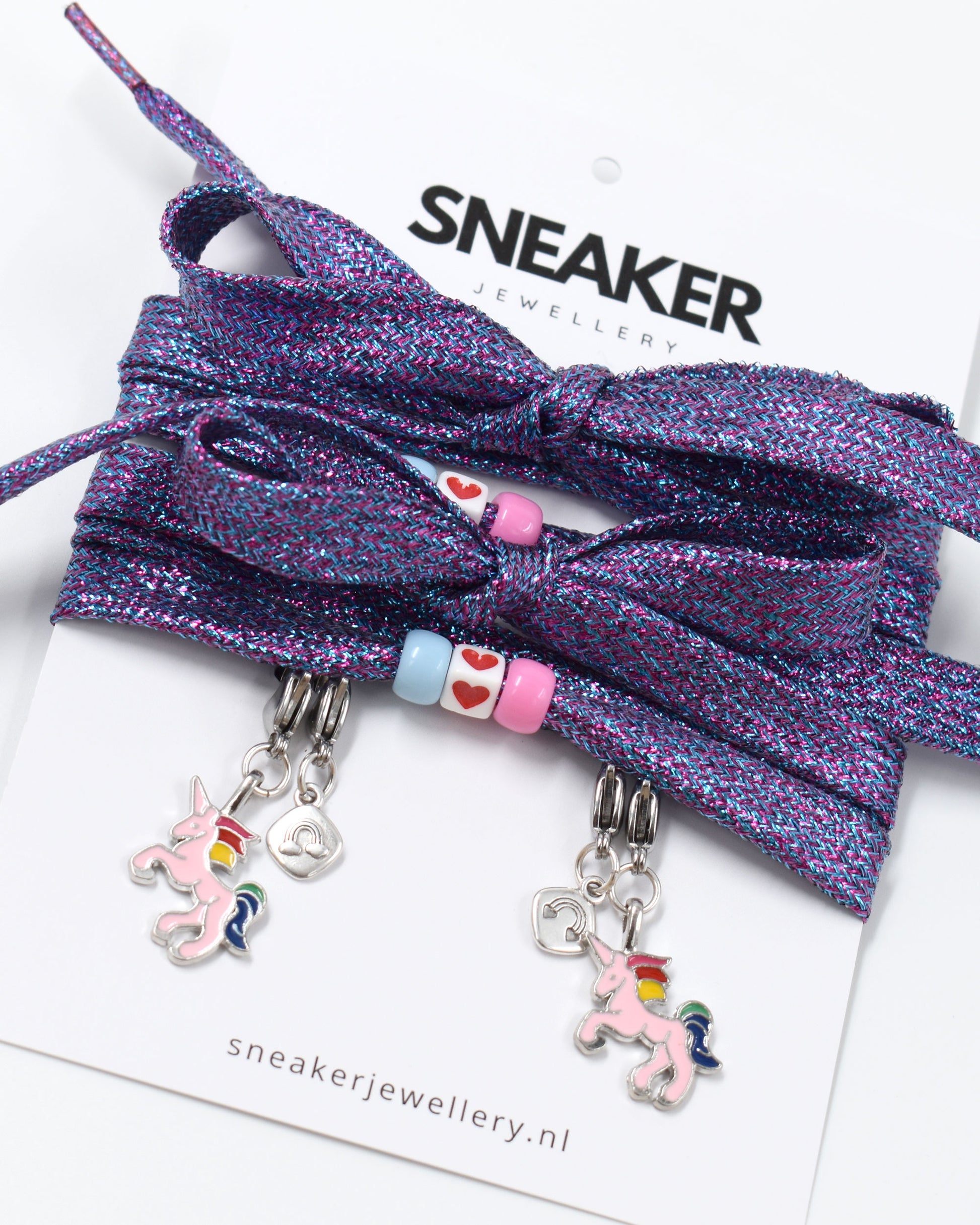 Geef je sneakers een gedurfde upgrade met onze veters en bedeltjes. Deze glitter veters met eenhoorn en regenboog bedels geven je sneakers een unieke look. Ook super leuk om cadeau te geven.