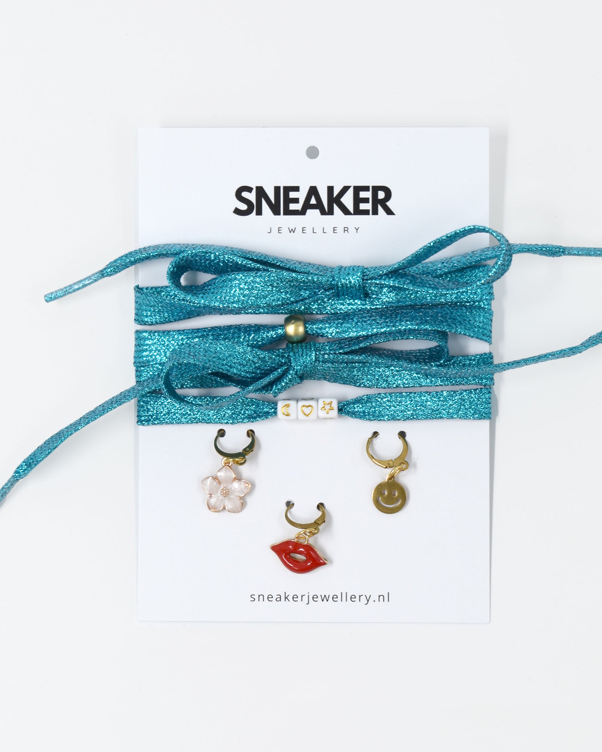 Geef je sneakers een gedurfde upgrade met onze veters en bedeltjes. Deze glitter blauwe veters met goudkleurige bedels geven je sneakers een unieke, speelse look. Ook leuk om cadeau te geven!