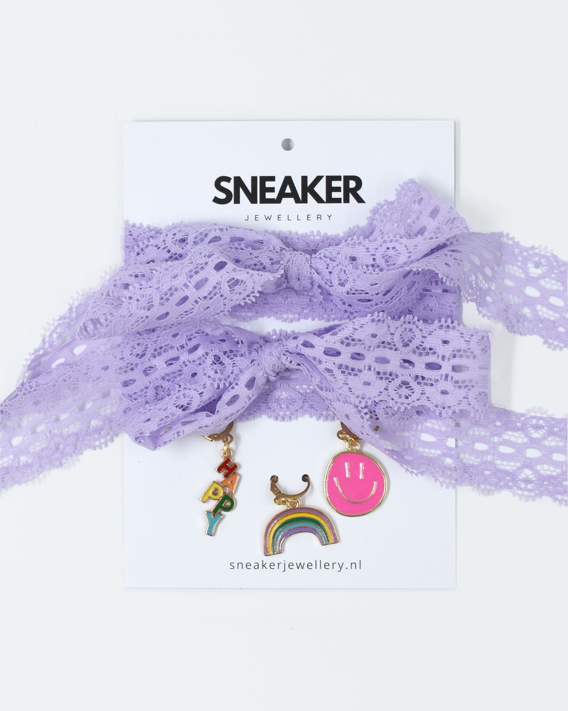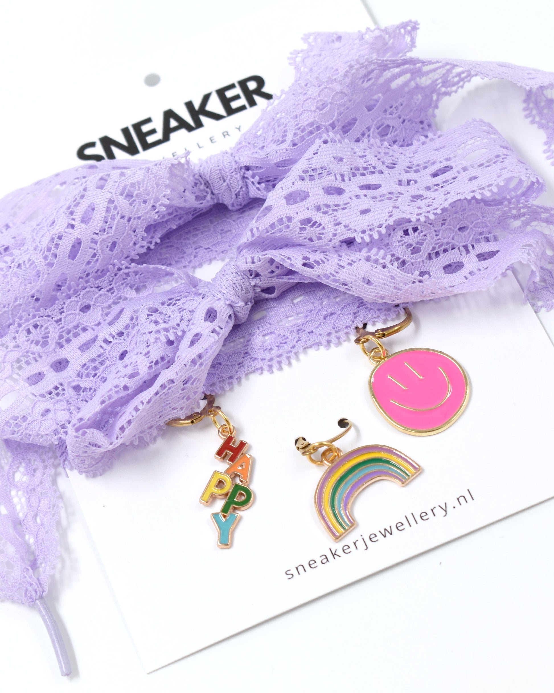 Geef je sneakers een gedurfde upgrade met onze veters en bedeltjes. Deze paarse kanten veters met goudkleurige bedels geven je sneakers een unieke, speelse look. Ook leuk om cadeau te geven!